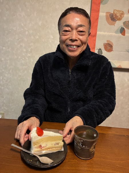 | 2月9日は私の66歳の誕生日です。ずいぶんと年を重ねたものですね。 この日は喜楽館の出番でしたが、米紫君と鯛蔵君がプレゼントを持って駆け付けてくれました。小鯛君は出番で、ずっと一緒です。 ケーキとパパスのシャツがプレゼント。 |