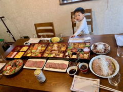 | 延び延びになっていた古希のお祝いです。やっと実現しました。チビがじっとしていないので自宅でやろうということに。 息子の支払いで上等のお肉を買って、お寿司をとって、家族揃って祝ってもらって最高の一日でした。 これからは身体を大事にしてボチボチやろうと思っています! |